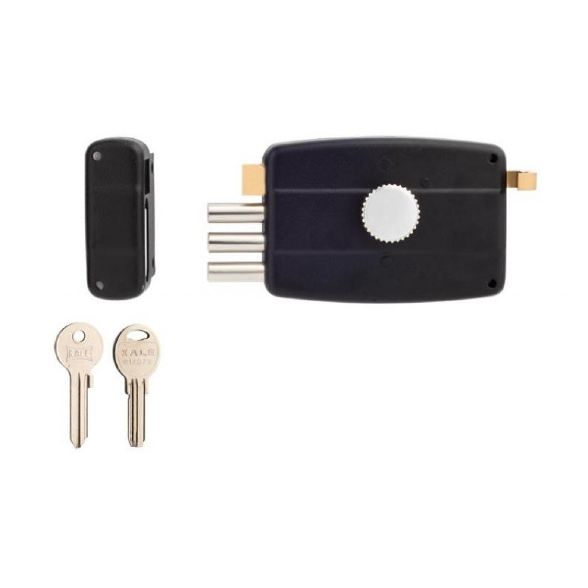 Замок накладний Kale 2001 А 3MT. Зовні замок відкривається повороту ключа в циліндрі, з внутрішнього боку поворотною ручкою. Замок обладнаний 3 ригелями з діаметром 12 мм і вильотом 33 мм. Завдяки надійній конструкції, замок підходить на металеві та броновані двері, складські приміщення, гаражні та іншого типу двері та ворота.