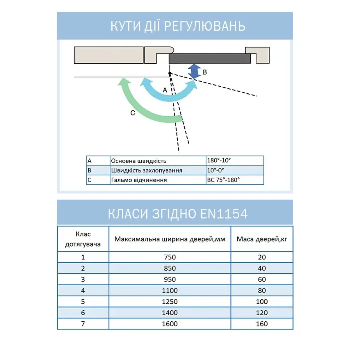 Сила закриття відповідає 2 і 3 класу, що дає змогу встановлювати пристрій на дверях вагою до 45 і до 65 кг.