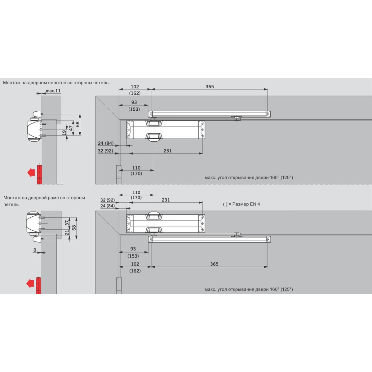 Сила закриття відповідає 3 і 4 класу, що дозволяє встановлювати пристрій на дверях із шириною стулки до 950 і до 1 100 мм.