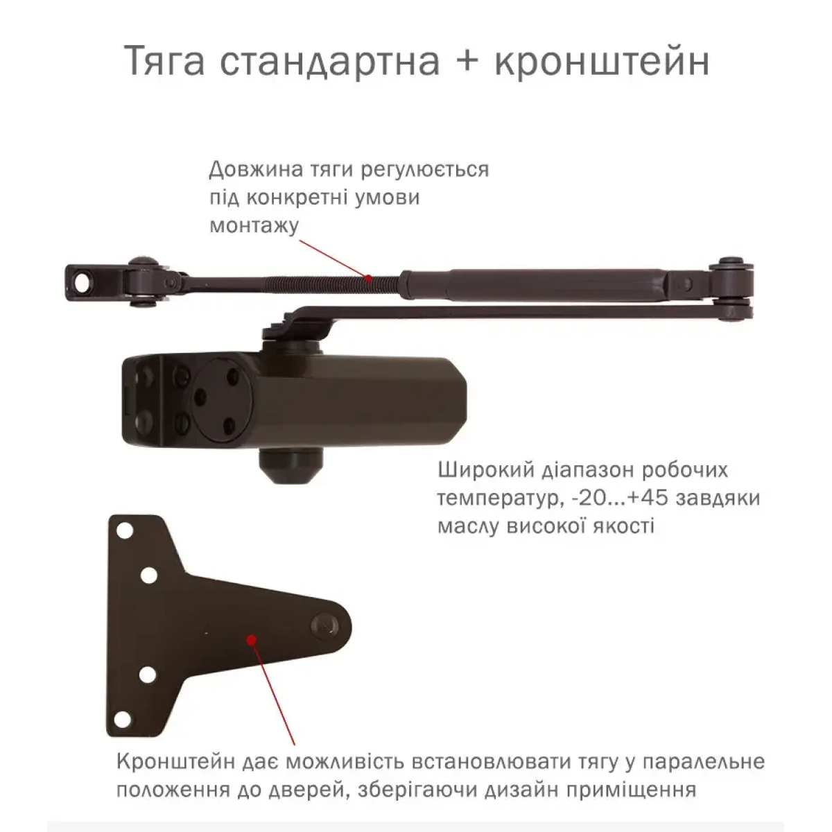 Комплектація: дотягувач, комплект кріплення, тяга стандартна, кронштейн паралельної тяги.