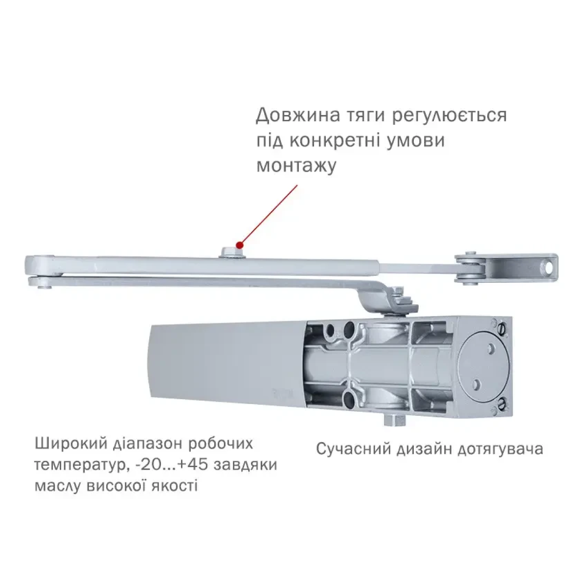 Стандартна тяга, т.з. «коліно», надає два варіанта встановлення дотягувача на дверях.