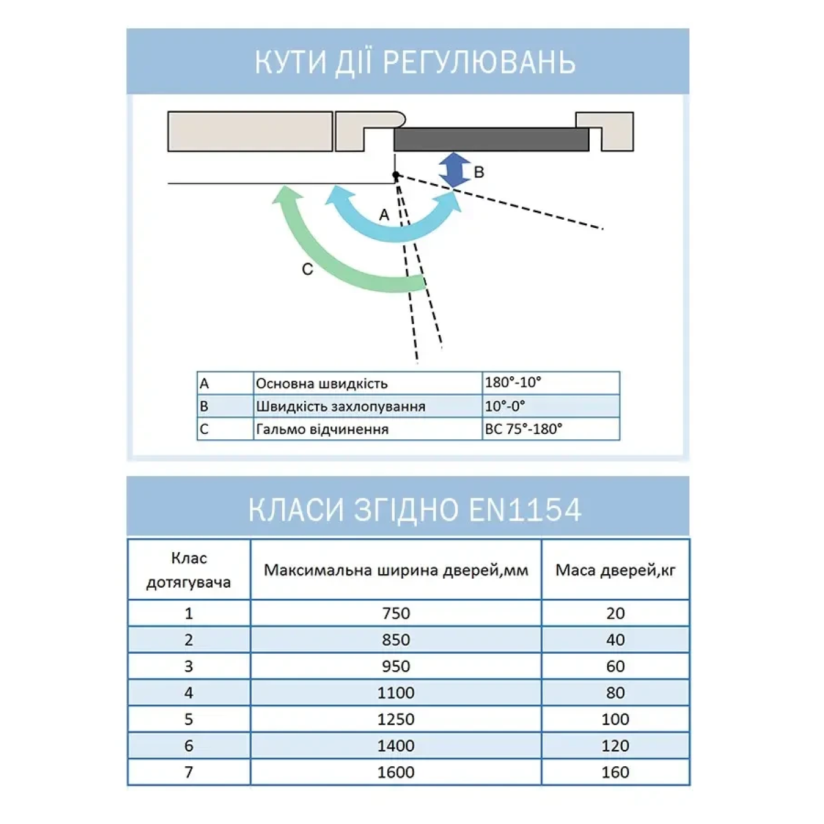 Регулювання класу дотягувача відбувається шляхом переміщення дотягувача по дверному полотну, див. монтажний шаблон який входить в комплектацію з дотягувачем.