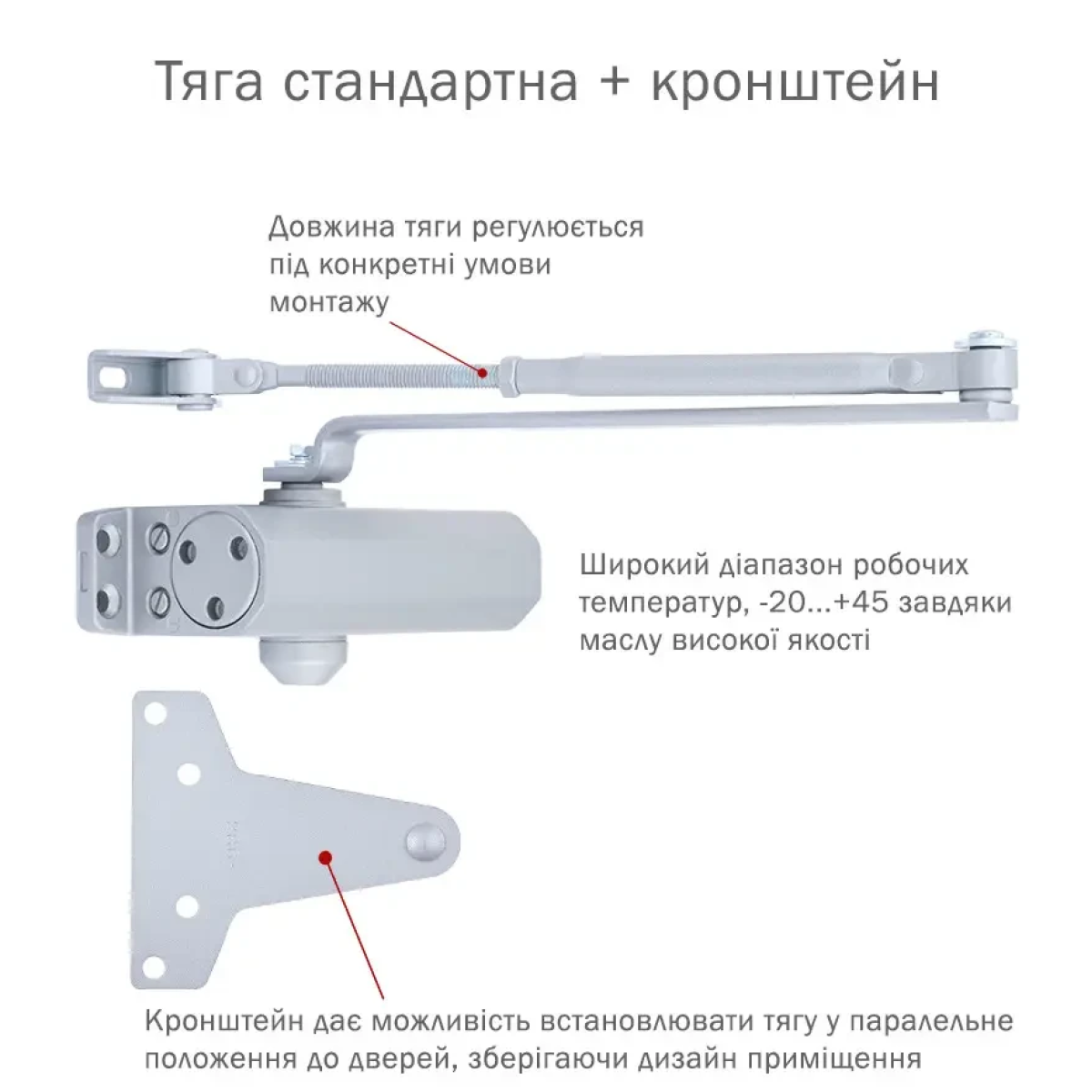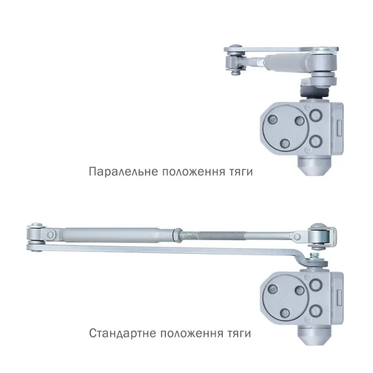 Комплектація: дотягувач, комплект кріплення, тяга стандартна, кронштейн паралельної тяги.