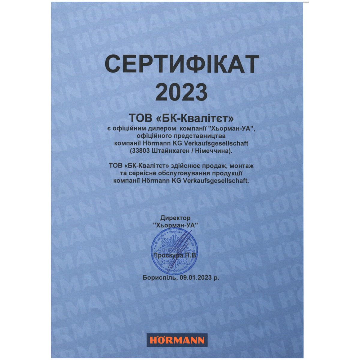 Гаражні ворота Hormann тішитимуть свого власника бездоганним зовнішнім виглядом, безшумною роботою й неперевершеною надійністю навіть після десяти років експлуатації. І це не дивно, адже компанія Hörmann (Hormann, Херман, Хйоман, Hoermann) вже понад 75 років є найбільшим виробником воріт у Європі та завжди робить ставку на «Якість без компромісів». Секційні ворота Hormann мають покриття неперевершене за своєю стійкістю до ультрафіолетового випромінювання й корозії полотна. Це стосується як лакофарбового покриття, так і декоративних плівок. Основні позиції запчастин і продукції завжди на складі в Україні, але треба враховувати можливі терміни постачання воріт під час замовлення нестандартних розмірів або дизайну гаражних воріт.