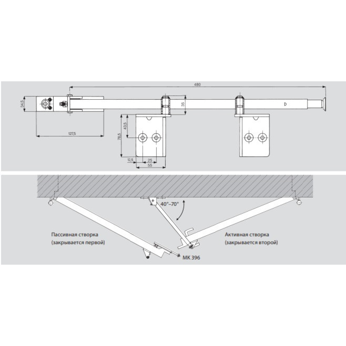 Механічний координатор порядку закривання стулок DORMA SR390 для двостулкових сталевих дверей накладного типу. монтується на верхню частину дверної коробки. Обов'язково комплектується штовхачем МК 396.